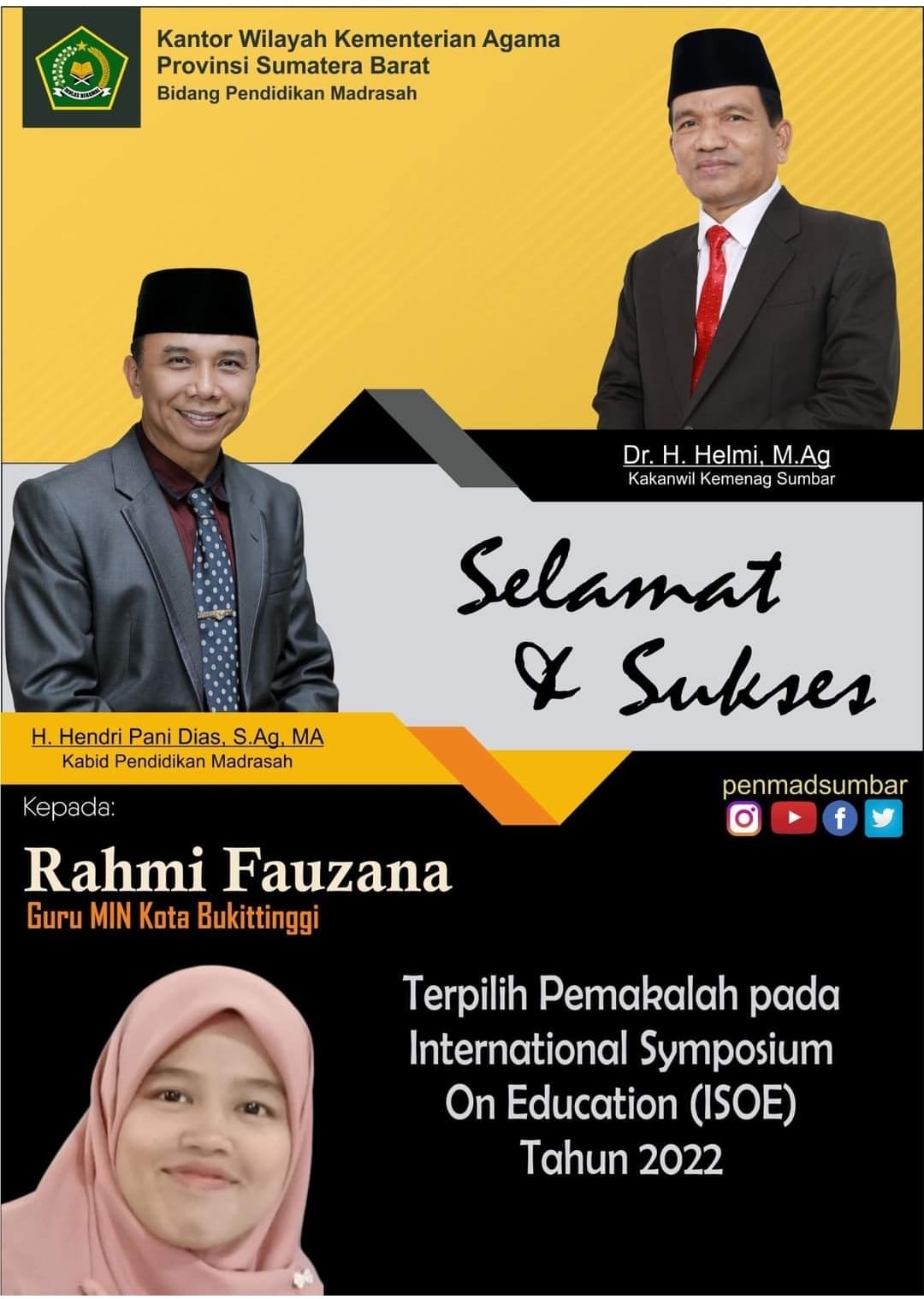 Guru MIN Kota Bukittinggi, Rahmi Fauzana terpilih sebagai pemakalah Internasional Symposium on Education (ISOE) 2022.