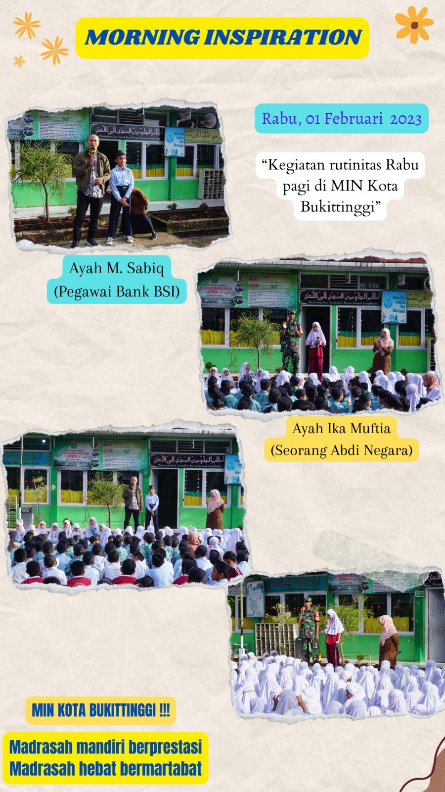 Kami selalu menunggu Rabu-rabu menginspirasi berikutnya, agar kami para siswa/I MIN Kota Bukittinggi selalu giat dalam belajar guna menggapai cita-cita yang telah kami gantungkan setinggi-tingginya.