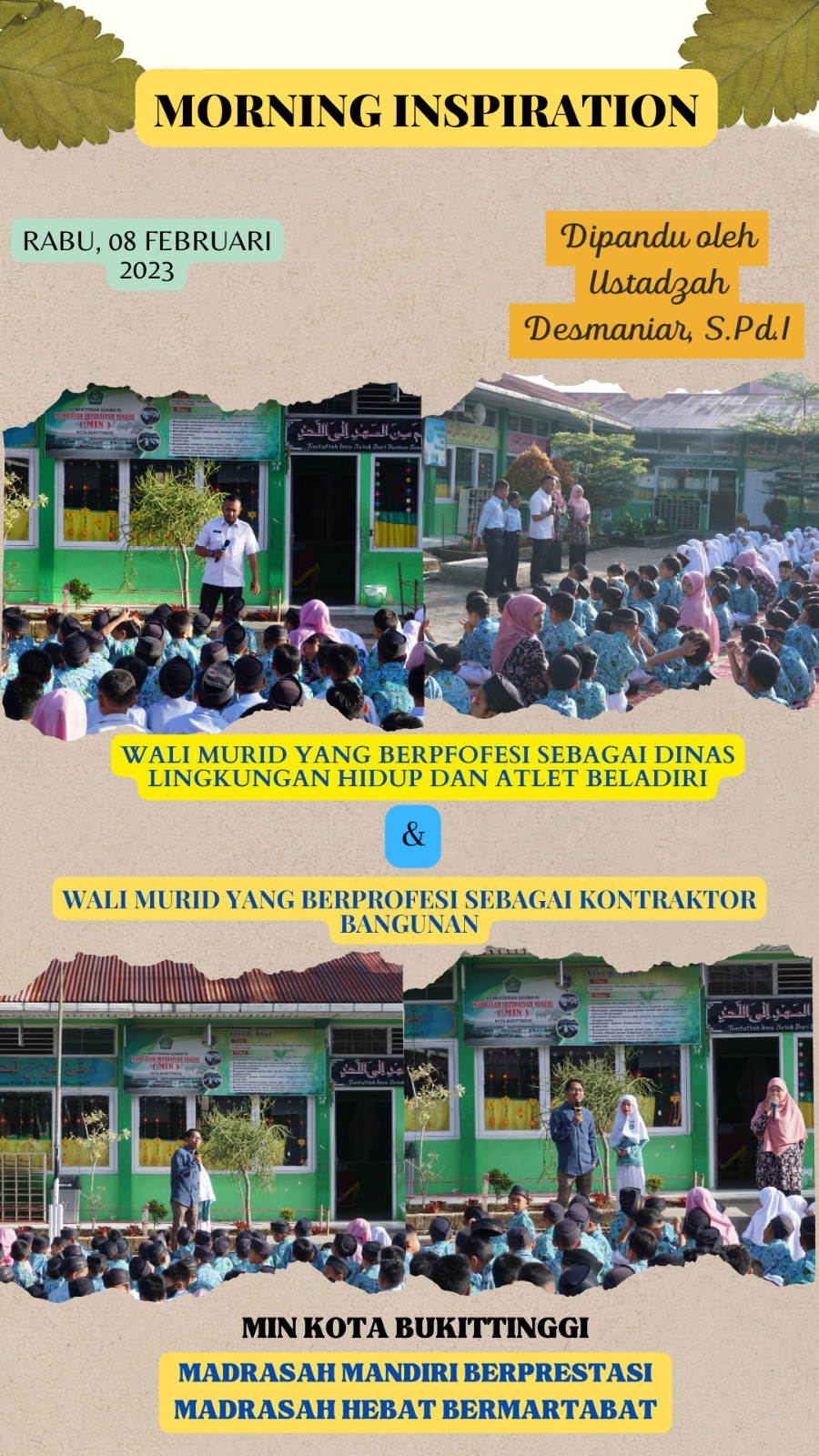 Sebagaimana biasanya rutinitas rabu pagi di MIN Kota Bukittinggi adalah diawali dengan kegiatan ”Morning Inspiration”, Alhamdulillah ini adalah minggu ke-4 dilaksanakannya kegiatan pagi Menginspirasi ini.