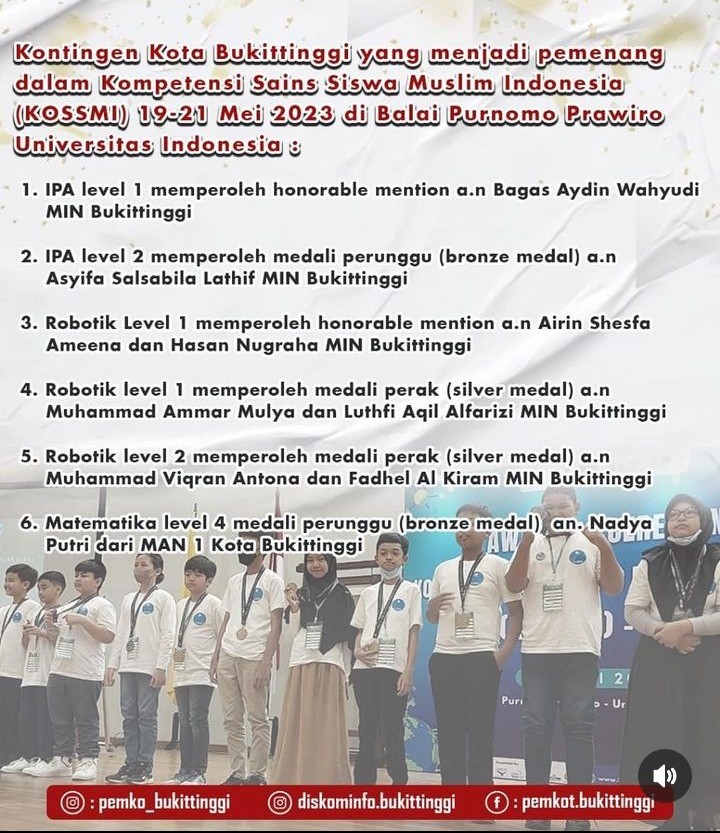 Selamat kepada Siswa MIN Kota Bukittinggi yang menjadi pemenang dalam Kompetensi Sains Siswa Muslim Indonesia (KOSSMI) 19-21 Mei 2023 di Balai Purnomo Prawiro Universitas Indonesia :