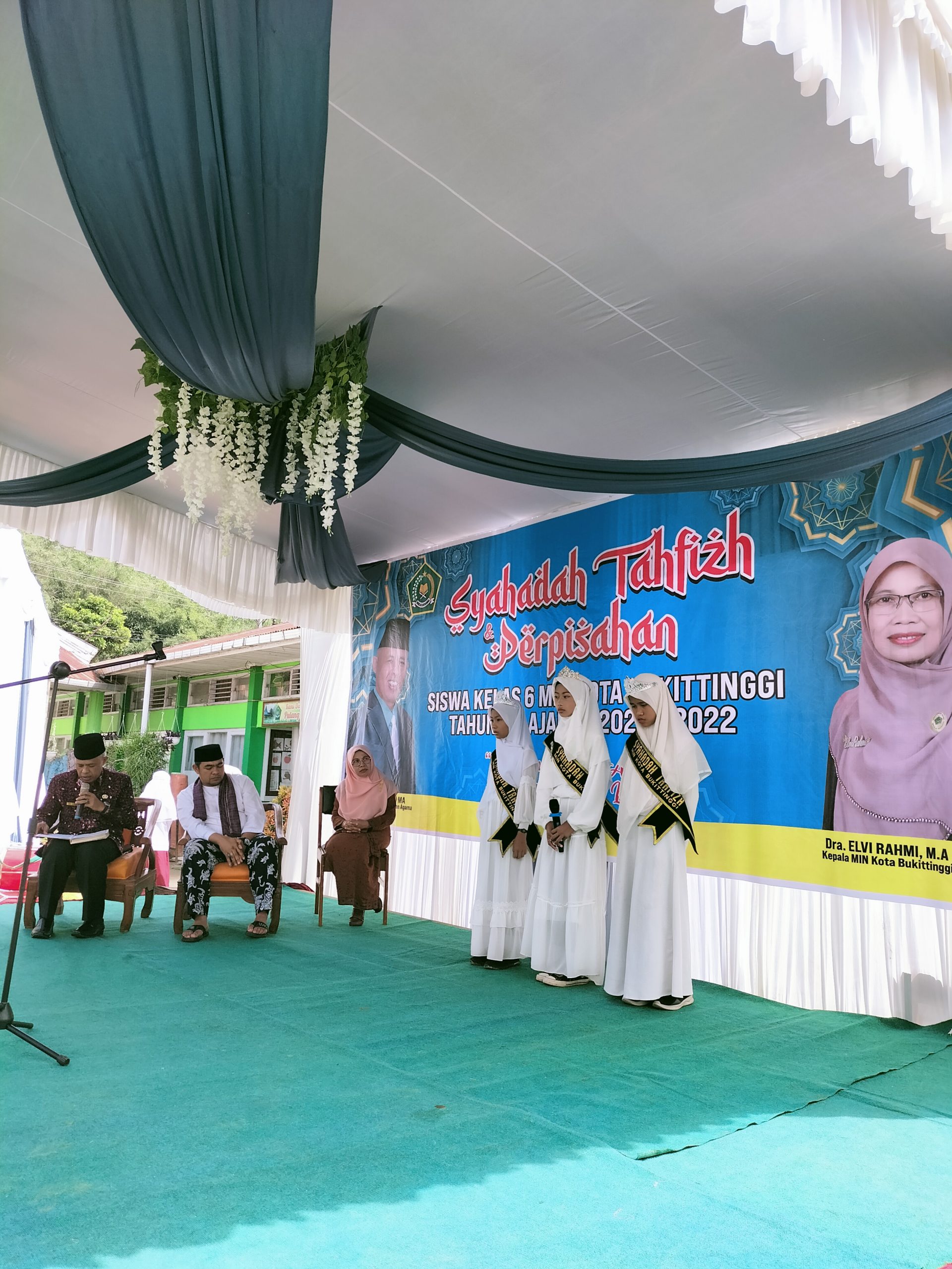 MIN Kota Bukittinggim engadakan syahdah tahfidz tanggal 21 Mei 2022. Rangkaian acara ini dibuka oleh Kemenag Bukittinggi Bapak H. Eri Iswandi. Untuk peserta syahadah tahfidz merupakan siswa kelas 6 MIN Kota Bukittinggi yang sudah menghafal Al-Qur’an juz 30.